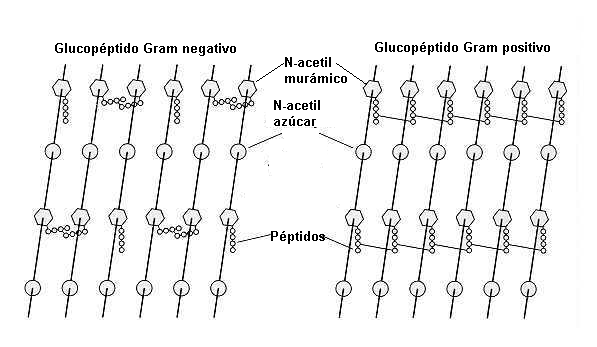 Tanto las bacterias Gram positivas como las Gram negativas poseen una pared celular de peptidoglicanos que les confieren su forma característica y les provee de protección mecánica. Dos grupos de bacterias carecen de pared celular: