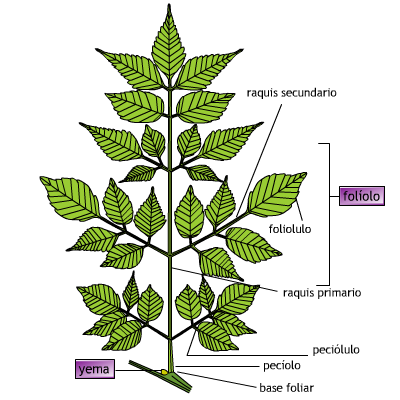 pecioladas, alternas, 2-3 imparipinnadas, de 25 a 50 cm de largo y 15 a