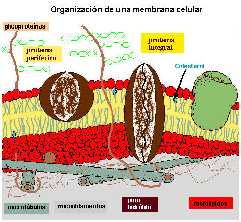 El modelo del Mosaico FluidoLas bicapas lipídicas son fluidas, los fosfolípidos individuales difunden rápidamente por la superficie bidimensional de la membrana. Esta estructura, que se propone para las membrana biológicas, se conoce como el modelo de mosaico fluido, donde mosaico se refiere al hecho que también la integran proteínas, colesterol, ergoesterol, y otros tipos de moléculas insertadas entre los fofolípidos. Los fosfolípidos pueden moverse (por ej. en una membrana de bacteria) a la parte opuesta de la membrana en la cual se encuentra en unos pocos minutos, a temperatura ambiente. Esto es una distancia cientos de veces superior al tamaño del fosfolípido. Las proteínas de la membrana difunden por ella en la misma forma que los fosfolípidos, por supuesto a menor velocidad, dado su tamaño. Un fosfolípido tiene unos 650 d ( daltons o Peso Molecular) y el peso promedio de una proteína puede llegar a 100.000 d. De tanto en tanto un fosfolípido puede "darse vuelta" en la membrana y mirar a la cara opuesta, pero esto es poco común. Para que esto acontezca se requiere que la "cabeza" hidrofílica del fosfolípido atraviese al interior de la membrana que es altamente hidrofóbico, y que las "colas" hidrofóbicas se expongan al medio acuoso. Hay un buenos diagramas del modelo de mosaico fluido de membrana en nuestro servidor o en The WWW Cell Biology Course. http://lenti.med.umn.edu/~mwd/cell_www/chapter2/membrane.html Hay que tener en cuenta que existen moléculas de colesterol "embebidas" en la membrana, el colesterol es un componente necesario de las membranas biológicas. El colesterol rompe las interacciones tipo Van der Waals entre las "colas" de los fosfolípidos. Esto hace que la membrana sea mas fluida. Por lo tanto una manera de controlar la fluidez de la membrana es regulando el nivel de colesterol en la misma. Otra manera en la cual la célula controla la fluidez de su membrana es regulando la proporción de la saturación (cantidad de dobles enlaces en las mismas) de las cadenas hidrocarbonadas de los ácidos grasos ( "colas") de los fosfolípidos. Un grupo de fosfolipidos cuyos ácidos grasos son saturados pueden agruparse muy cerca unos de otro y formar numerosas uniones tipo Van der Walls que mantienen unidos a los fosfolípidos. Aquellos que tiene cadenas insaturadas rompen las uniones Van der Walls y los grupos al impedir que los fosfolípidos se acerquen.