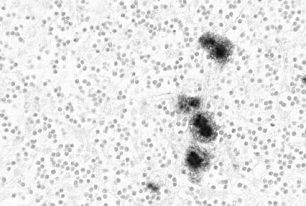 y/o placas tipo amiloide (las células apoptóticas poseen una morfología