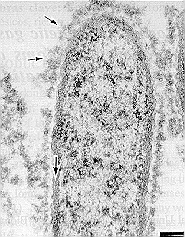 meteri all electrón denso (flechas pequeñas) rodeando las bacterias.