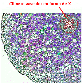Raíz tetrarca, notar el xilema en forma de X en un corte transversal