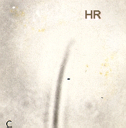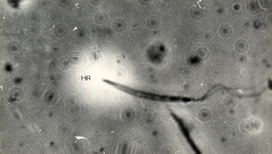 Fig. 8: Espermatozoide de Bufo arenarum incubado en film de gelatina de colágeno (Contraste de fases x 1.900) HR: Halo de reacción |