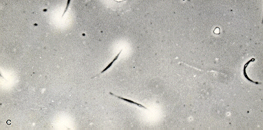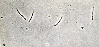 os datos aportados hasta el momento, indican que el acrosoma de los espermatozoides de Leptodactylus chaquensis y Bufo arenarum , pueden experimentar cambios interpretables como la expresión morfológica de una reacción acrosómica espontánea. Esta serie de cambios culmina con la eliminación del contenido del mismo y por lo menos parte de este contenido estaría compuesto por una o varias enzimas proteolíticas.[Arriba]