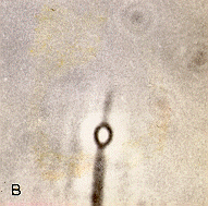 Hemos incubado, además, espermatozoides de Bufo arenarum en extendidos de gelatina. Tal como puede observarse en la Fig. 8, también en esta especie el halo de reacción se detecta en la porción anterior del espermatozoide, es decir en la zona que corresponde al acrosoma.