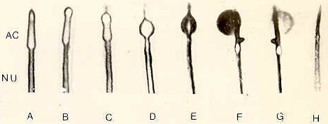 Cuando los espermatozoides se suspenden en soluciones hipotónicas ( Ringer 0,1 - Holtfreter 0,1 ) acontecen en su acrosoma una serio de cambios los que, observados con microscopía de fases pueden resumirse como sigue. La porción anterior del acrosoma se redondea (Fig. 4:B ) transformándose gradualmente en una pequeña vesícula (Fig. 4: D, E) . Paralelamente, comienza a visualizarse una estructura aguzada ( Fig. 4: C, D, E ) la que, probablemente, se hallaba previamente recubierta por el acrosoma. El tamaño de la vesícula aumenta progresivamente y su contenido que se presenta ahora de aspecto oscuro (Fig. 4: F ) es finalmente liberado al medio. En el extremo del espermatozoide suele quedar el "fantasma" del acrosoma (Fig.4 : G ) el que termina, por desaparecer ( Fig.4 : H ).