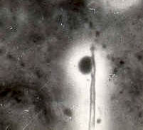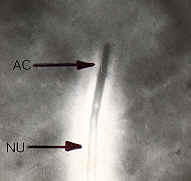 Fig. 5: Reacción acrosómica en Bufo arenarum (Contraste de fases x 1.800) AC: Acrosoma;NU: Núcleo. |