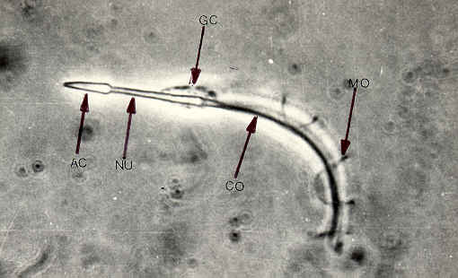 Fig. 3: Espermatozoide de Leptodactylus chaquensis (Contraste de fases x 2.500). AC: acrosoma;NU: núcleo; GC: gota citoplasmática; CO: cola; MO: membrana ondulante. |