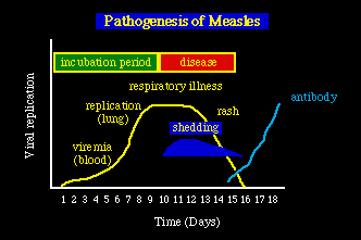 Replicación de los ParamyxovirusEn términos generales la replicación de los paramyxovirus es bastante similar a la de los rhabdoviruses. Una característica única e importante de la infección por el virus del sarampión es su habilidad para infectar de modo persistente las células cerebrales, mecanismo implicado en el SSPE La infección crónica por el VSa parece incluir al menos dos vías para una atenuación específica de la expresión del gen M. Primero, una regulación a la baja de la expresión del gen M como resultado de una finalización transcripcional ineficiente y una poliadenilación en el ORF que está contracorriente (el cual es expresado con normalidad). Segundo, se ha descrito una hipermutación condicionada de la región del gen M Lo que parece ser debido a la acción de un enzima celular que convierte las adenosinas a inosinas en el dsRNA (double-stranded-ARN-adenosine deaminase, dsRAD = ARN bicatenario Adenosín Deaminasa, dsRAD). Fíjese en que el dsRAD es también responsable para la edición específica de lugar del ARN del virus de la Hepatitis delta ! Otra característica importante de la replicación de los paramyxovirus es la gran diversidad de la expresión del gen P. Esto se debe tanto a la variedad de posibilidades translacionales (seleccionar cuál codón ATG será usado para iniciar la síntesis de proteína, ya sea la P ó la C) y también a la variedad transcripcional (como la inserción de cualquier residuo G en la región P del mRNA, lo que permite la expresión de la proteína V). Patogénesis de la infección por el virus del sarampiónEl virus del sarampión (VSa) es un patógeno clásico emergente. El VSa es relativamente una nueva infección para los humanos, evolucionó de un morbillivirus animal (El VSa se parece mucho a un patógeno del ganado vacuno conocido como el virus rinderpest). Se describión el sarampión por primera vez en el siglo X. Debido a que causa una infección aguda muy contagiosa que produce inmunidad de por vida, no tiene un reservorio animal y requiere un habitat urbano para sobrevivir (por encima de 200,000 personas). Las primeras ciudades con este tamaño aparecieron hace unos 3.000 años en Egitpo y Samaria. Y posiblemente fué cuando apareció el sarampión y las paperas. Estas ciudades permaneciern aisladas hasta que floreció el comercio. Y las epidemias (sarampión, viruela) empezaron hacia los 200-400 AD. El sarampión fué llevado al Nuevo Mundo por los Europeos y causaron miles de muertes entre los nativos de America. Un ejemplo reciente de una infección emergente por morbilliviru ocurrió en Australia en 1994. 14 caballos murieron por una infección por morbillivirus equino (EMV = equine morbillivirus) en Queensland. Dos personas que estaban en contacto con estos caballos se infectaron y uno de ellos desarrolló una severa enfermedad respiratoria. Un segundo caso fatal de infección por EMV fué descrito a 800 km de la primera zona. Estudios subsiguientes han revelado que la infección del EMV de los caballos es muy rara. Sin embargo el virus se ha hallado en los murciélagos, sugiriendo que estos animales pueden ser el reservorio natural de estos virus. El VSa es el mayor asesino de los niños del mundo. A nivel mundial, el VSa mata un millón de niños cada año de acuerdo con la OMS. El tamaño del problema se ha visto más claro después de que se ha hecho un esfuerzo gigantesco para vacunar cerca del 80% de los niños en la campaña de vacunación entre 19980 y 199o. Si este esfuerzo, el sarampión hubiera matado 3 millones de niños por año. A pesar de todo, la OMS y la UNICEF, trabajan denodadamente para aumentar los porcentajes de niños vacunados en las aldeas, pueblos y ciudades, incluyendo las áreas mas desfavorecidas, y para desarrollar vacunas anti-sarampión más eficaces en los niños menores de dos años. Esto es muy importante, ya que la infección es más severa en esa edad y son los que tienen más riesgo en las naciones en vías de desarrollo. En las naciones industrializadas, las epidemias por el VSa surgen a pesar de la vacunación. Por ejemplo, en US apareció una epidemia entre 1989 y 1991 que produjo 55,000 enfermos y cerca de 130 muertes. Se achacó la epidemia al hecho de que el % de vacunación infantil en los niños pre-escolares en las áreas más pobladas de las ciudades, estaba por debajo del 50%. Ultimamente la OMS y la UNICEF intentan erradicar el sarampión completamente. Es posible por varias razones: 1) no existe un reservorio animal, 2) solo hay un serotipo viral, 3) la mayoría de los casos se diagnostican clínicamente y 4) hay una vacuna efectiva disponible. (Una vacuna hecha de virus vivos atenuados que se administra a los 9 meses en las áreas donde el virus permanece prevalente y a los 15 meses en las demás partes; en USA se administra como parte de la vacunación MMR): Patogénesis: El sarampión es una infección de la infancia que se propaga por vía respiratoria.Después de la infección, el virus se reproduce en el tejido linfático, después entra en la corriente sanguínea (fase de viremia) y se propaga al resto del cuerpo llegando a los órganos diana (principalmente los pulmones) donde se reproduce otra vez. El período de incubación es de 10-14 días y es asintomático y al final del cual empieza a ser evidnete la enfermedad con: conjuntivitis, tos y fiebre. A los 2-3 días del inicio de los síntomas aparece la erupción cutánea característica de la enfermedad, que coincide con la aparición de la respuesta inmune. La convalescencia va acompañada con una inmunidad a la infección para toda la vida.