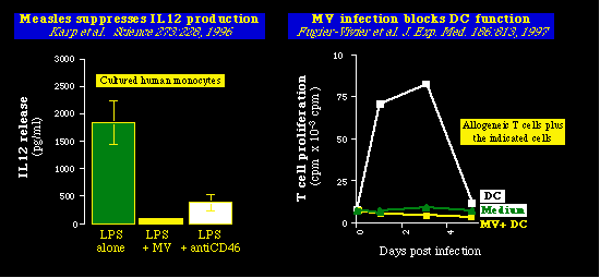 Se cree que el mecanismo por el cual el VSa produce una supresión de la respuesta inmune es la infección de las células dendríticas DC (dendritic cells, las cuales son responsables de la presentación del antígeno) y de otras células del sistema inmunitario. La infección de las células dendríticas por el VSa lleva a la apoptosis y a la inhibición de las DC para estimular la proliferación de las células T (que son una parte esencial para la elaboración de la respuesta inmune). Hay también una inhibicion de la interleucina (IL)-12 producida por los monocitos. Este fenómeno parece que ocurre, en parte, por la acción de enlaces cruzados mediados por el virus, en el receptor CD46 (Karp et al., Science 273:228, 1996). El IL-12 es crucial para el desarrollo de una respuesta Thl (requerida para la generación de respuestas mediadas por células, las cuales proveen la línea primaria de defensa en contra de las infecciones virales). Autoinmunidad. Además de la supresión de la respuesta inmune, la infección del sarampión puede estar asociada con autoinmunidad. De moso específico, una enfermedad desmielinizante autoinmune, la encefalomielitis post-infecciosa (EPI) es una complicación importante que aparece a los 14-28 días de la infección con una incidencia de 1 en 1000 casos. Se asocia a una respuesta inmune en contra de una proteína básica de la mielina. No está claro cómo se inicia este proceso, aunque es posible que los antígenos del VSa puedan imitar a la mielina (imitación molecular). De este modo la respuesta inmune anti-VSa puede atacar a un atígeno propio: la mielina.