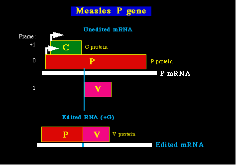 Virus del sarampión: Proteínas de la Ribonucleoproteína (RNP) Las Ribonucleoproteínas del virus del sarampión incluyen la Polimerasa, Nucleoproteínas y Fosfoproteínas, las cuales son más ó menos equivalentes a su homólogas en los rhabdovirus. Una diferencia importante entre estas dos familias virales es que los genes P del virus del sarampión codifican dos proteínas más, ademas de la fosfoproteína. Estas dos proteínas extra son codificadas por el mRNA de los genes P, pero son traducidas usando diferentes codones de iniciación de metionina y secuencias de lectura superpuestas. El primero de estas proteínas es la proteína C, la cual es una proteína básica pequeña producida desde una plantilla de lectura abierta (open reading frame (ORF) ) que se superpone al N-terminus de la región de los genes P, en la secuencia +1. La proteína C es codificada a partir de las transcripciones de los genes P por medio de una iniciación interna translacional. Debe resaltarse que, en una proporción molar, la proteína C es el mayor producto de los genes P en muchos de los paramixovirus, y varias formas de la proteína C pueden ser producidas en algunos virus, debido al empleo de algunos codones de iniciación de methionina. La función de la proteína C parece ser la de ayudar a regular los cambios entre la transcripción mRNA y la replicación viral. De modo específico, la proteína C inhibe la síntesis de mRNA, pero tiene un efecto mínimo en la replicación del genoma. La segunda proteína de los genes P es la proteína V. El mRNA de los genes P del virus del sarampión es editado de modo co-transcripcional en un lugar específico situado en la parte final del C ORF. Este evento de edición del ARN comprende la adición de un residuo G no secuenciado en ésta posición durante la síntesis del mRNA. (Ocurre porque la ARN polimerasa "tartamudea" cuando encuentra una cadena de residuos C en la plantilla de la cadena del ARN; por qué ocurre en este lugar y no en otro puede estar en relación con la estructura del ARN). El resultado de la adición de este residuo G extra al mRNA, es que después de la translación, la mitad del N-terminal de las secuencias de la proteína P no pueden ser unidas a la parte normal C-terminus, pero si lo hacen a una región acidófila rica en cistina de la proteína V de la ORF (la cual está en -1 ORF en relación a P). La proteína formada de este modo se la conoce como proteína V y su función no es bien conocida, aunque hay evidencia que sugiere que su acción es la de inhibir la replicación del genoma, sin actuar sobre la transcripción del mRNA. ¿ Cuál es la causa de la complejidad del gen P ? Probablemente no es la de ahorrar espacio, ya que el genoma es grande y puede codificar otras pequeñas proteínas. Lo más probable es que es un modo de co-expresar proteínas, las cuales pueden interaccionar ó funcionar en un punto común en el proceso de la replicación